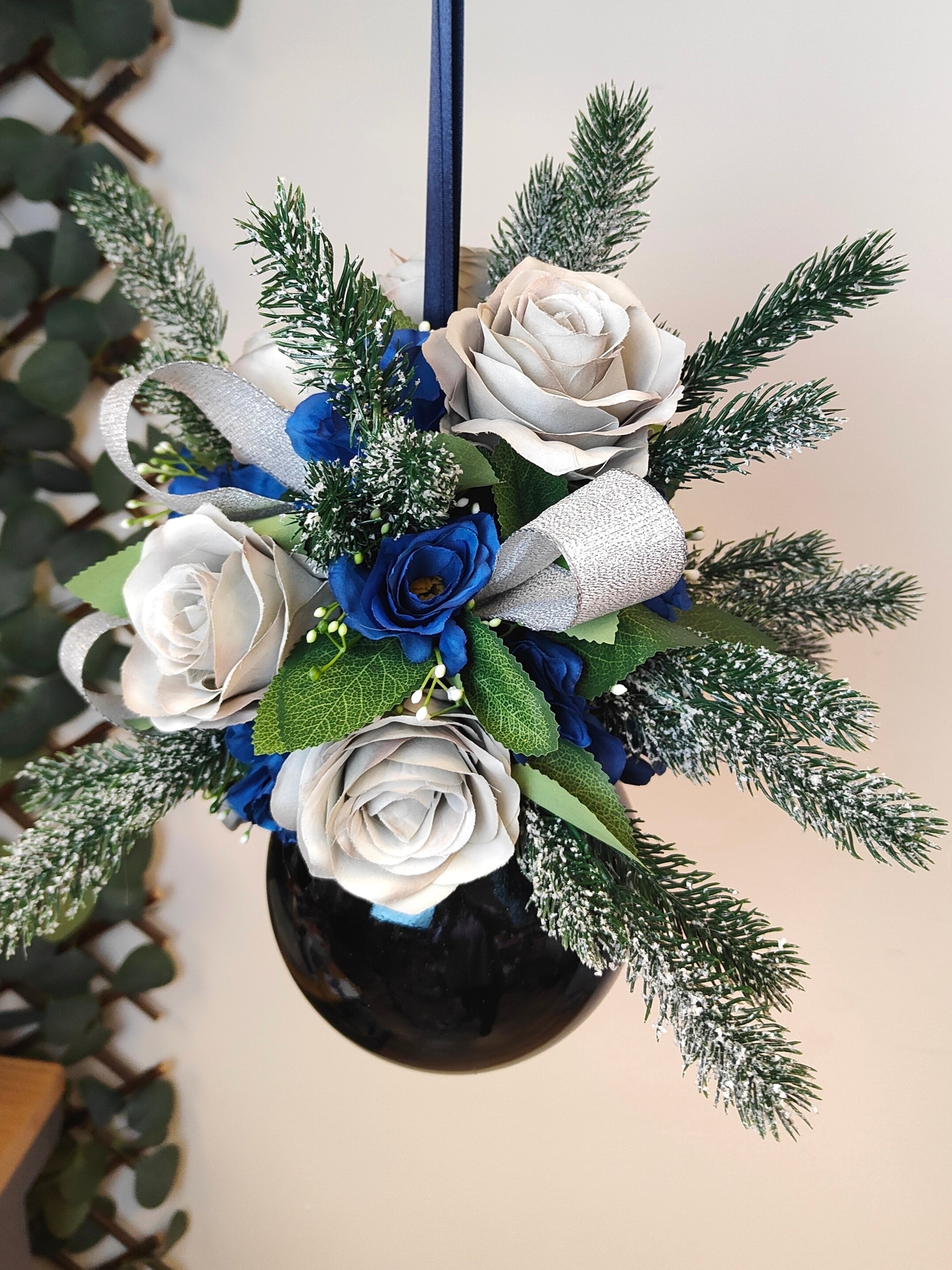 Grey Navy Blue Silver Flower Christmas Navy Bauble Artificial