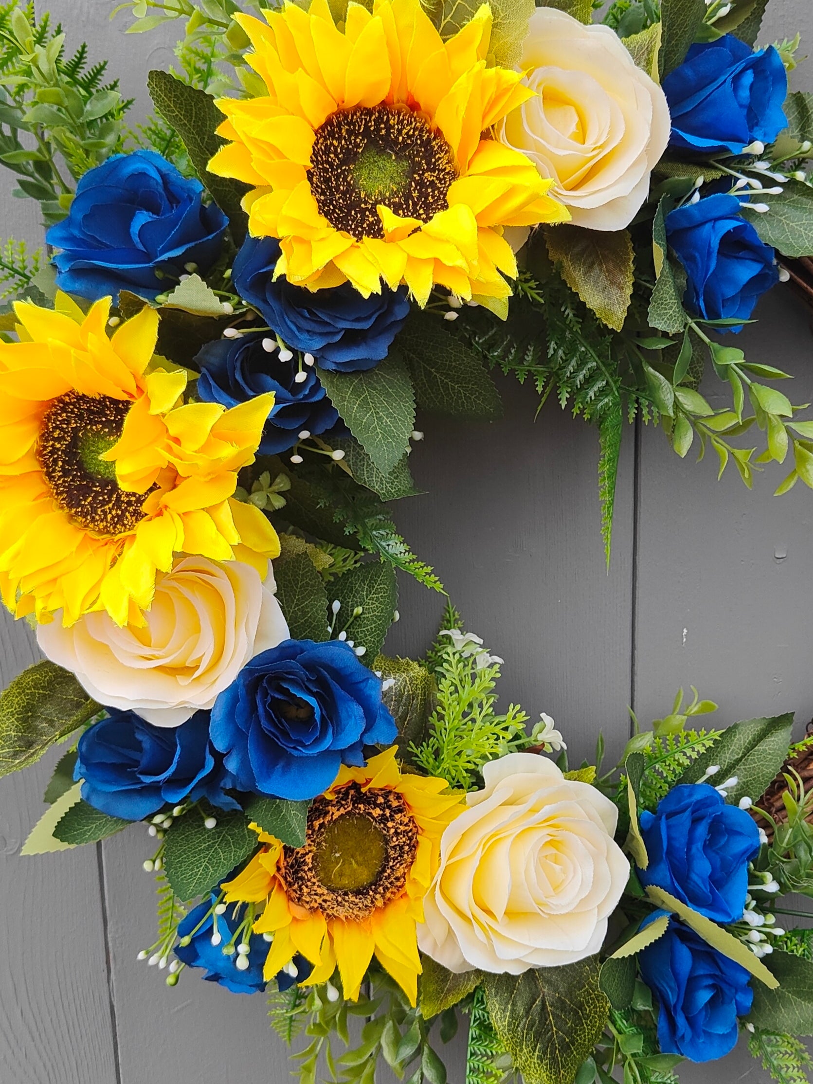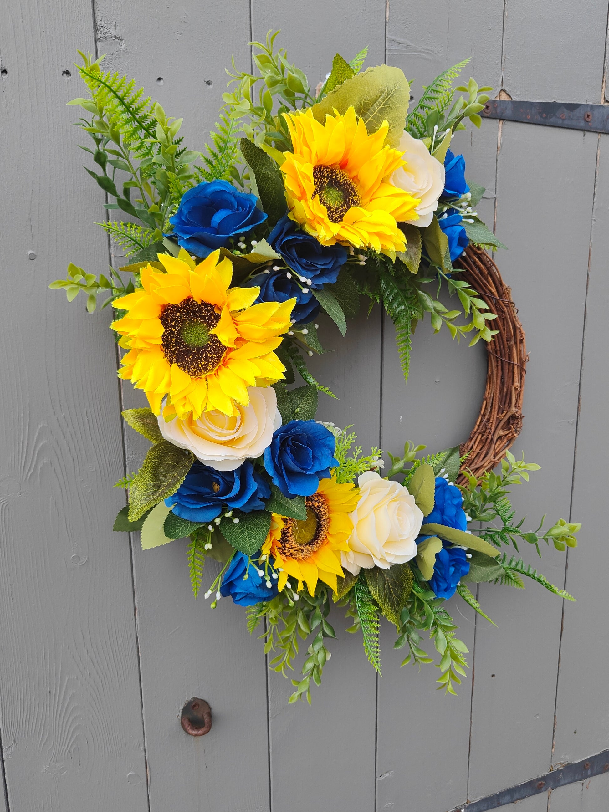 Blue Roses & Yellow Sunflower Faux Flower Grapevine Wreath