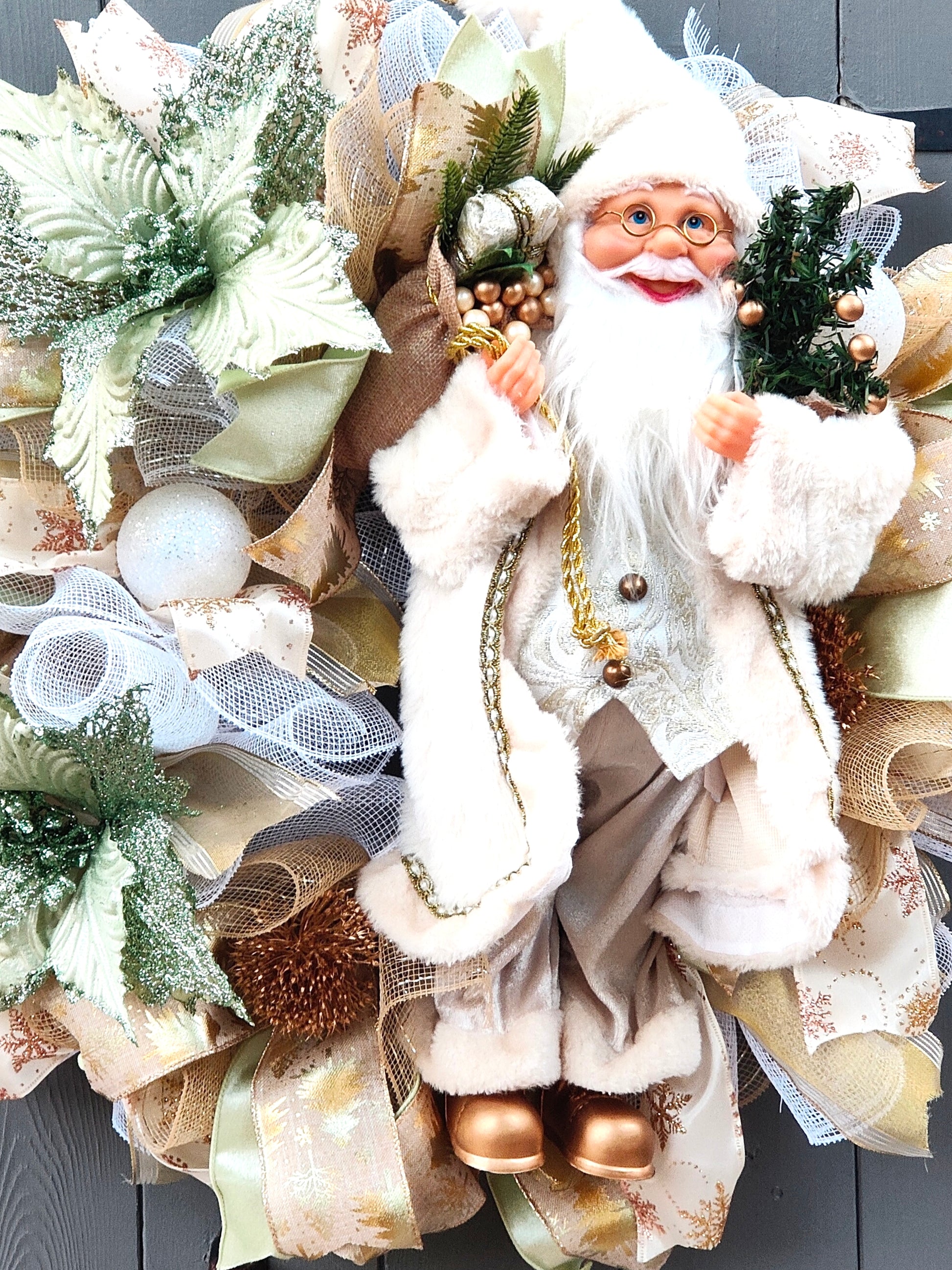 Elevate your front door with our handcrafted Nordic Santa Christmas wreath. Featuring Santa, Poinsettia, baubles and ribbon. This wreath captures that magical moment of Christmas.