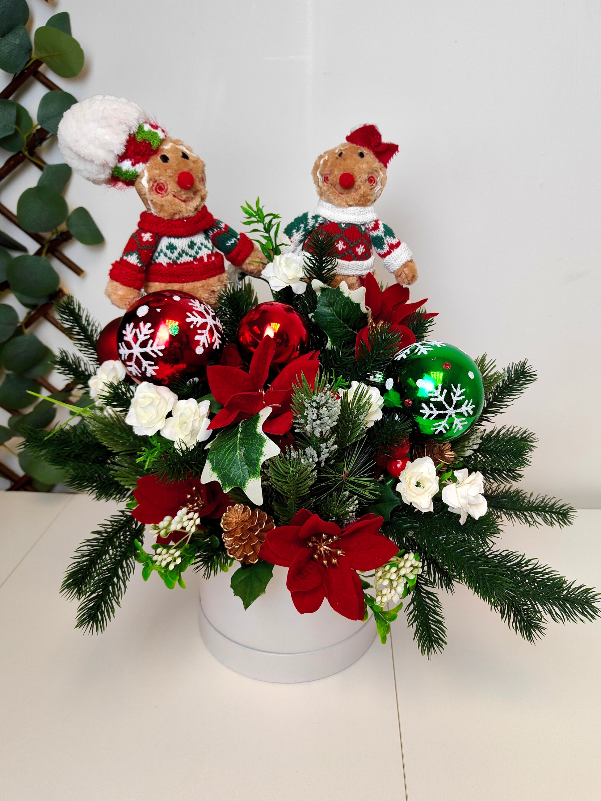 Gingerbread Man & Girl Poinsettia Hat Box Arrangement – Artificial Christmas Centerpiece