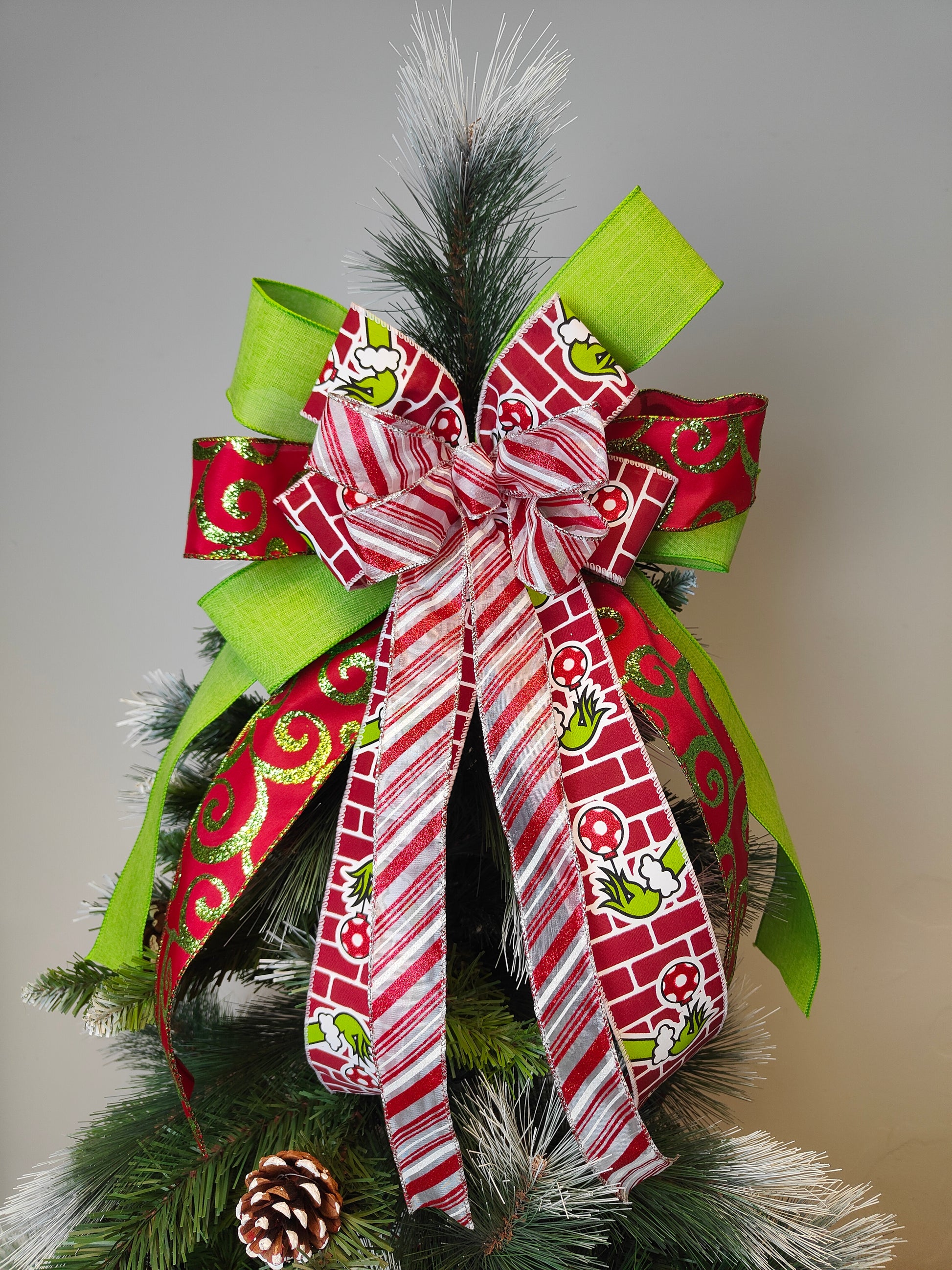 Handmade Red and White Green Christmas Green Monster litter Tree Topper Designer Bow.