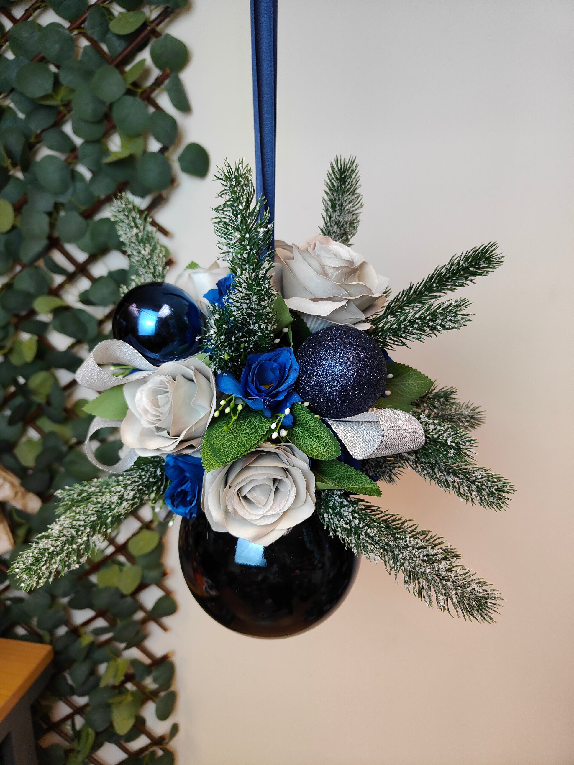 Hand-crafted with Artificial Roses , festive greenery, and Candyland accents on a Navy Blue bauble. It’s the perfect hanging centerpiece .