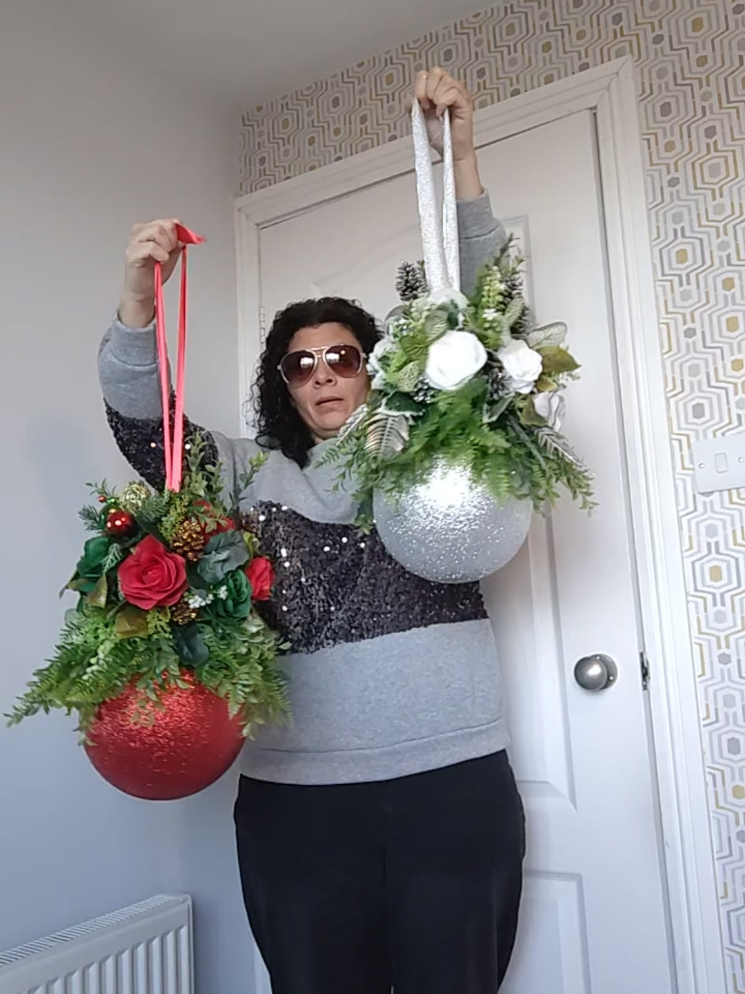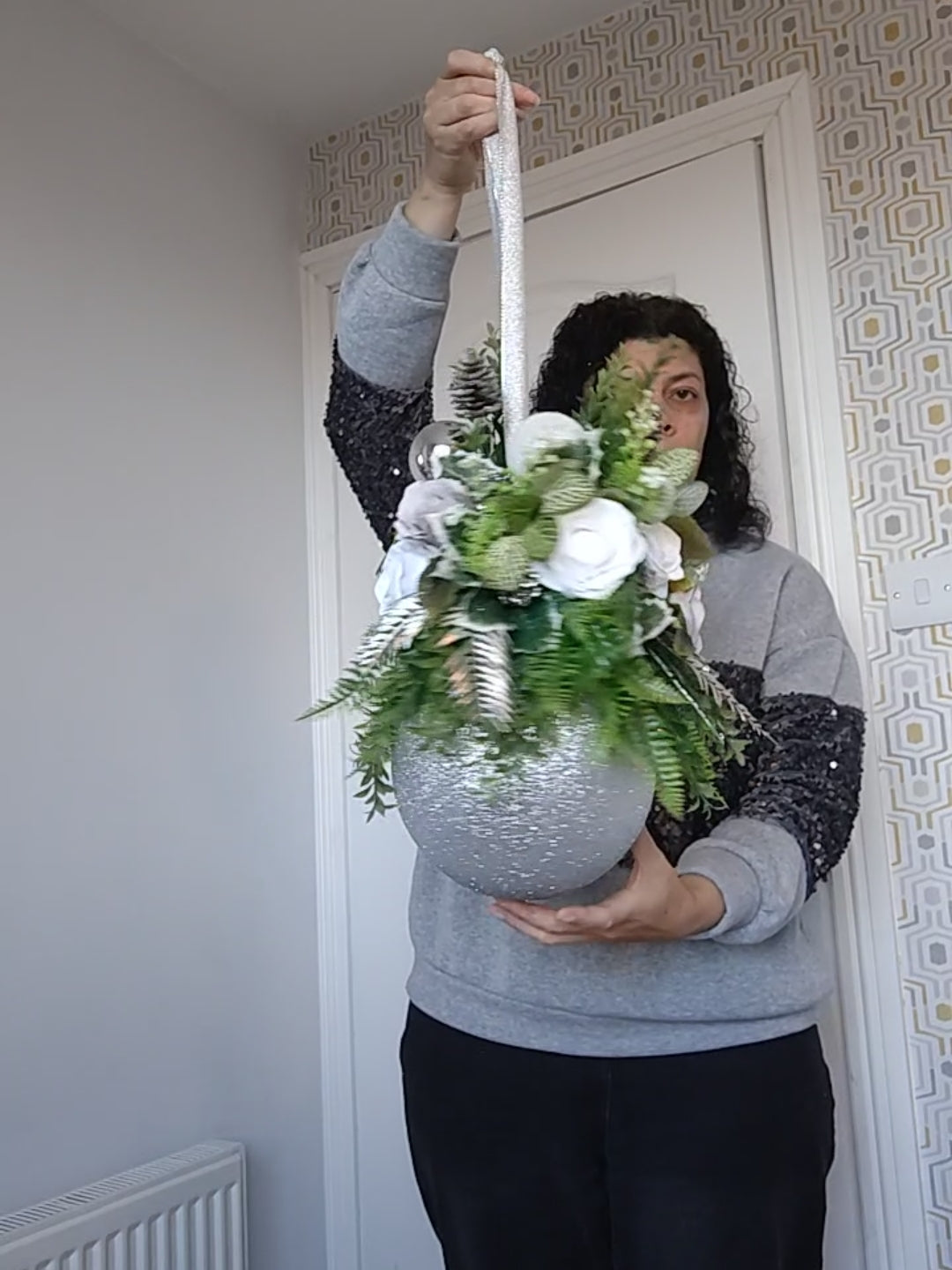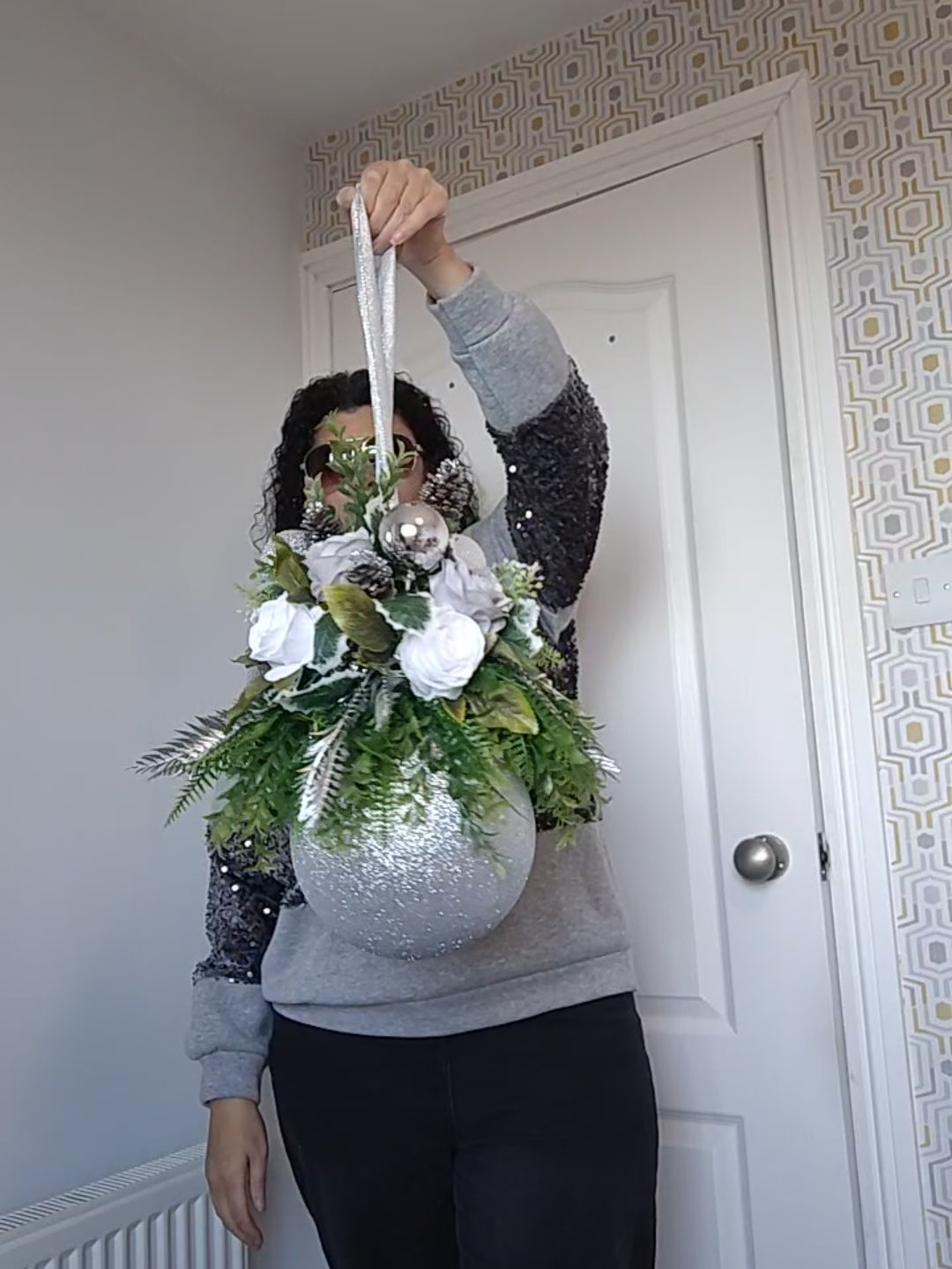 Hand-crafted with Grey and White Artificial Roses , and festive greenery, on a Red bauble. It’s the perfect hanging centerpiece .