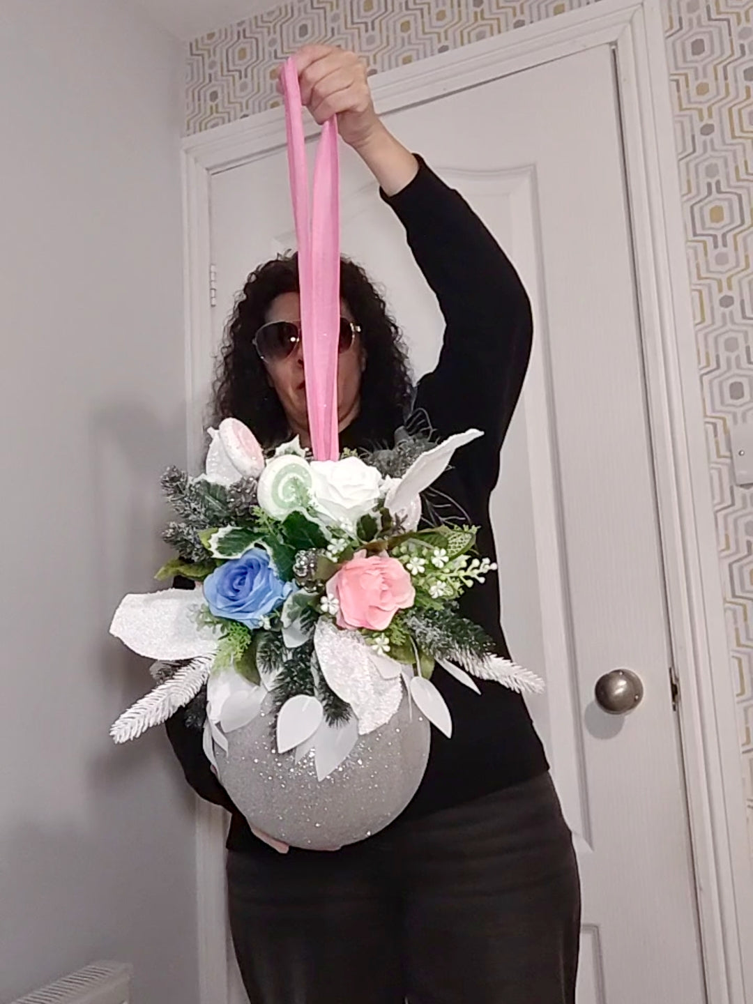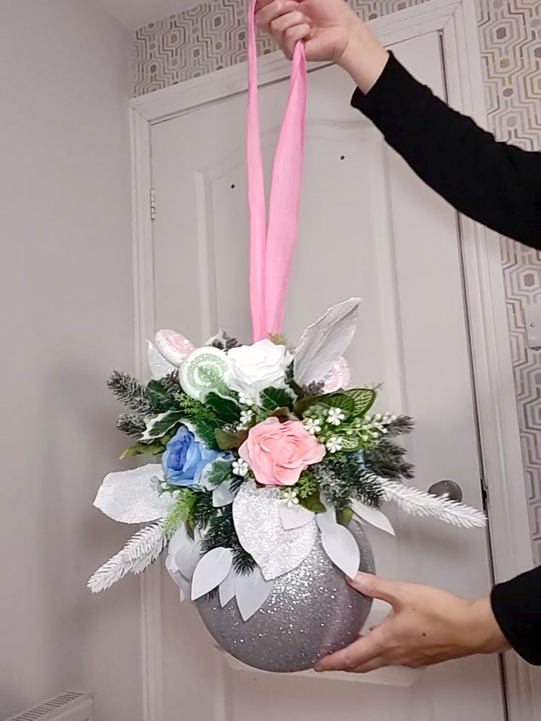 Hand-crafted with Pink, Blue and White Artificial Roses , festive greenery, on a Silver bauble. It’s the perfect hanging centerpiece .