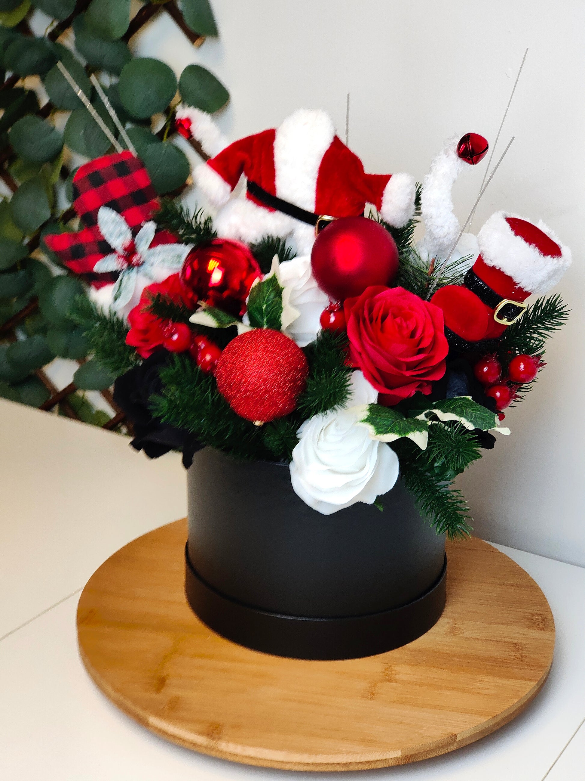 Santa Rose Christmas Hat Box Arrangement – Artificial Christmas Centerpiece