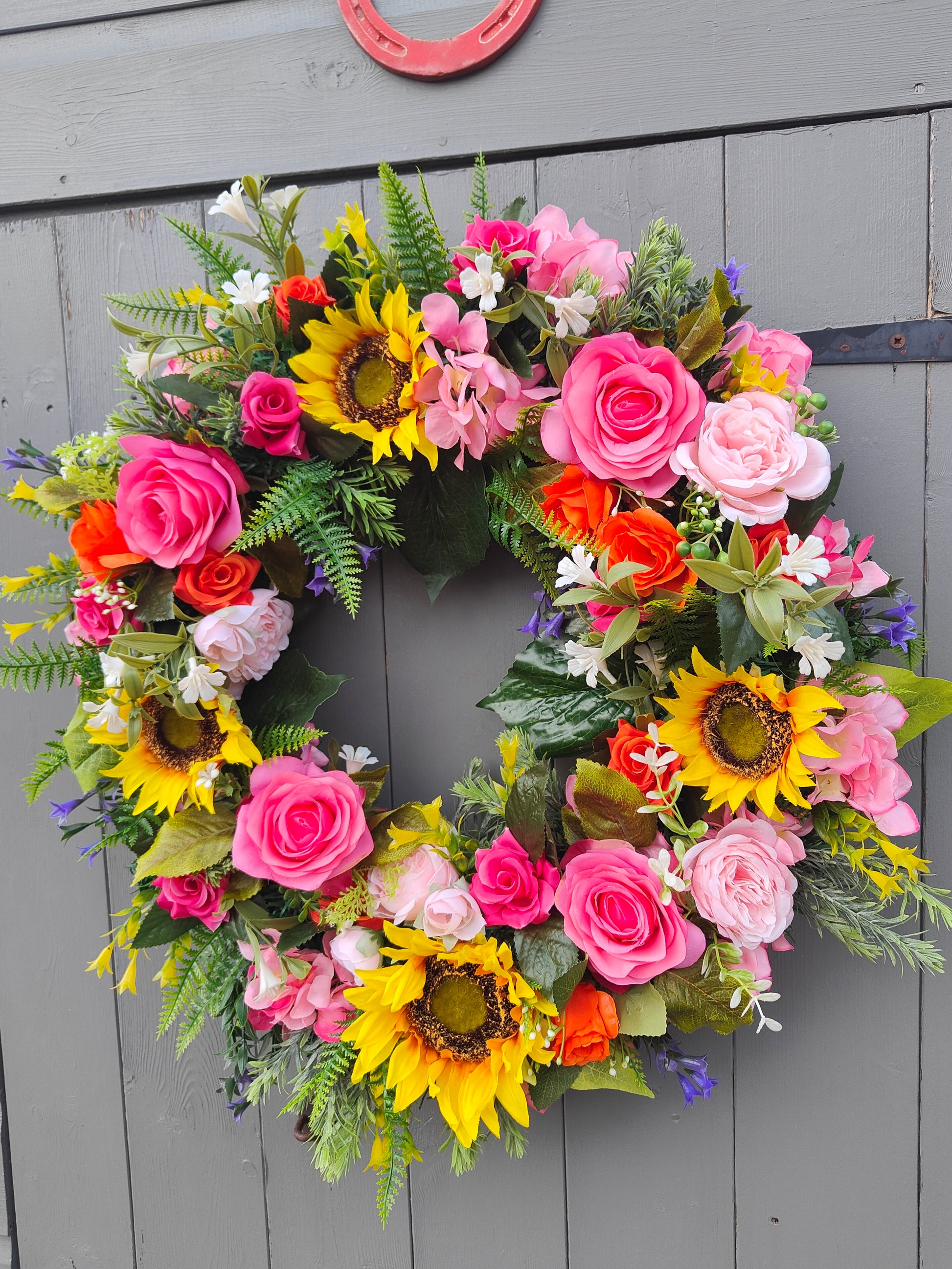 Sunflower & Rose Faux Flower Wreath – Bright Yellow, Pink & Orange – Spring & Summer Decor
