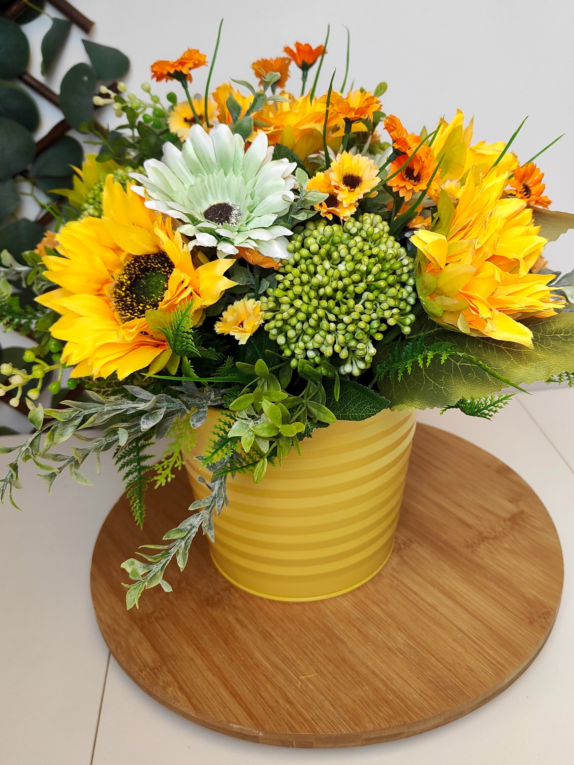 Brighten any space with this cheerful sunflower and gerbera artificial flower arrangement, designed to bring a warm, summery feel all year long. Set in a vibrant yellow planter with lush green foliage, this piece adds instant charm to homes, offices, and gift occasions—without the hassle of watering or maintenance.